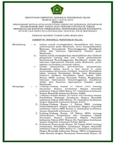Kepdirjen Pendidikan Islam No. 8621 Tahun 2025 menjadi SK keempat terkait Juknis pengelolaan dana bantuan operasional sekolah pada madrasah.