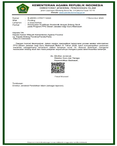 Surat Dirjen Pendis No. 288 Tahun 2025 Pedoman Linieritas Kualifikasi Akademik dan Mata Pelajaran PPG