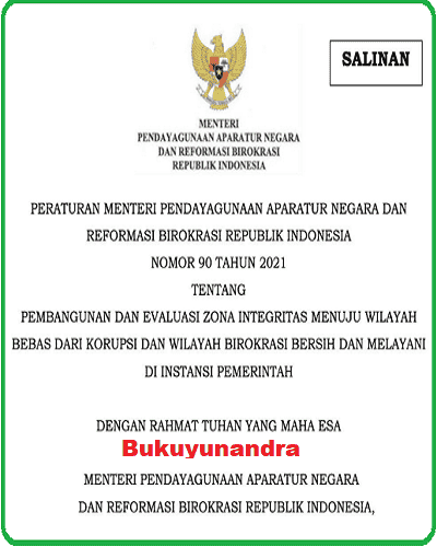 BukuYunandra.com. Permenpanrab Nomor 90 Tahun 2021 Pembangunan dan Evaluasi Zona Integritas menuju WBK dan WBBM.